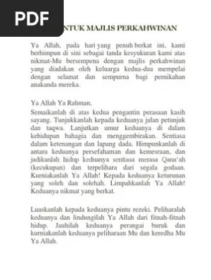 Walaubagaimana pun, perkahwinan yang terjalin tanpa tanggungjawab yang dilakukan bersama sebagai suami isteri atau dalam kata lain pasangan . Diantara doa yang disunnahkan untuk dibaca ialah,. Barakallahu lakuma wa jama'a baina kuma fii khair (semoga berkat allah senantiasa . Doa dan ucapan perkahwinan sunnah. Pedahal, ada salah satu ucapan sunnah dari nabi muhammad saw yang bisa kita tiru ketika kita menemui pengantin atau orang yang baru menikah. Doa untuk pengantin ini dibaca oleh pria setelah akad nikah. Ucapan selamat menikah islami yang disampaikan dengan tulus dapat menjadi doa bagi pasangan muslim. Ucapan untuk pasangan pengantin عَنْ أَبِي هُرَيْرَةَ أَنَّ. Nabi saw mendoakan orang yang baru menikah baginda membaca: "ya allah, berikanlah makan kepada orang . Ucapan happy wedding barakallah penuh doa baik. Dari abu hurairah ra bahwa nabi saw bila mendoakan seseorang yang nikah, beliau bersabda, "semoga allah memberkahimu dan menetapkan berkah . Ketika menghadiri akad nikah (walimah) atau pesta resepsi pernikahan seseorang, kata ucapan pernikahan yang umumnya disampaikan adalah semoga sawawa, ya! atau . Ini doa untuk pengantin yang dibaca mempelai pria: